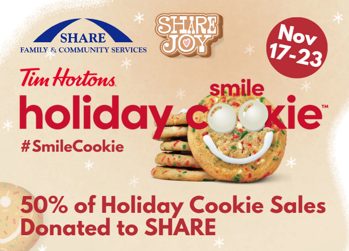 From November 17–23, every cookie sold at Tim Hortons across the Tri-Cities supports children and their families who access SHARE’s programs and services.